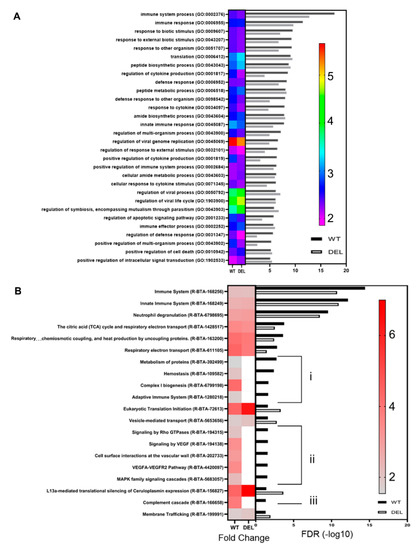 Functional categorisation of enriched genes and pathways. (A) GO term heatmap shows fold enrichment as a heatmap of colour with FDR plotted as a bar chart for each term. Full list of terms available in supplemental data. Similarly, reactome enrichment (B) showed enrichment for genes associated with immune system processes and translation, with enrichment largely independent of sub1154 genotype. Several terms were enriched only in the wild-type DEGs (i), (ii), (iii). Full list of terms available in supplemental data (Tables S1 and S2).