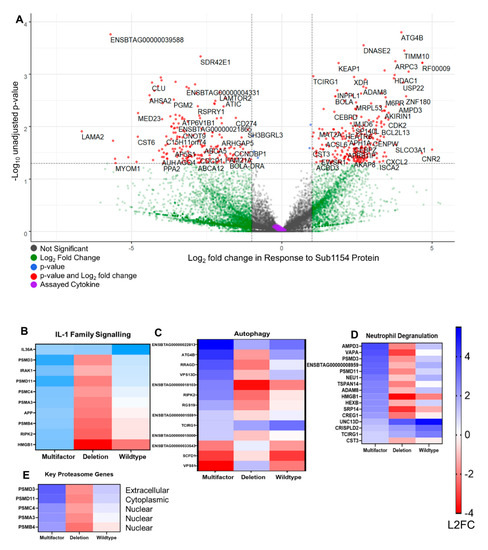 Transcriptional programming dependent on SUB1154 protein. (A) Multifactor analysis revealed the transcriptional programme changes caused specifically by the presence of SUB1154 protein (i.e., ATG4B is overexpressed in the presence of S. uberis expressing SUB1154 protein). Genes in red were then used for subsequent reactome or GO term enrichment. Cytokines assayed in Figure 1; Figure 2 are shaded in purple. Heatmaps were drawn to disentangle DEGs from those that are specifically regulated in response to SUB1154 protein. GO terms IL-1 Family Signalling (B), Autophagy (C), and Neutrophil degranulation (D) were chosen as they have significant FDR values in Table S3. Key proteasome genes (E) were responsible for several GO terms (See also Figure S3). Colour intensity denotes log2 fold-change, and all genes shown were significant (unadjusted p-value ≤ 0.05) in the multifactor analysis.