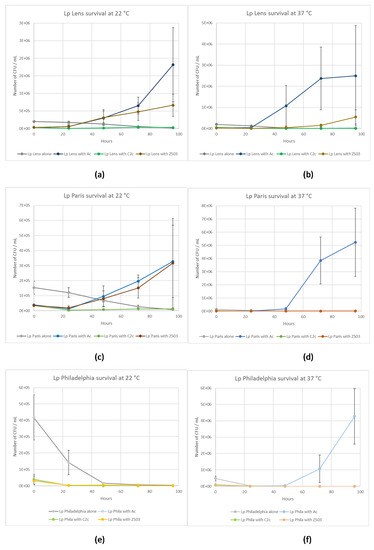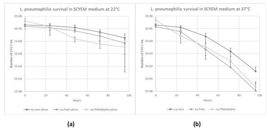 The survival of the three L. pneumophila strains in the calf serum-casein-yeast extract medium (SCYEM) was evaluated at 22 °C and 37 °C (Figure 1a,b). The survival of L. pneumophila Lens decreased to 2 × 104 CFU/mL and to 40 CFU/mL in SCYEM medium within 96 h at 22 °C and 37 °C, respectively. The survival of L. pneumophila Paris decreased to 7 × 103 CFU/mL and to 1 CFU/mL in SCYEM medium within 96 h at 22 °C and 37 °C, respectively. Finally, the survival of L. pneumophila Philadelphia decreased to 3 × 103 CFU/mL and to 2 CFU/mL in SCYEM medium within 96 h at 22 °C and 37 °C, respectively.
