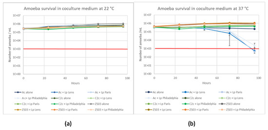 Amoeba survival at 22 °C (a) and 37 °C (b) in coculture medium in the presence or absence of the three L. pneumophila strains (Lens, Paris, and Philadelphia). The red bar is the detection limit of the Malassez cell counting. Results are expressed as the mean +/− 95% CI (Confidence Interval based on the standard error of the mean).