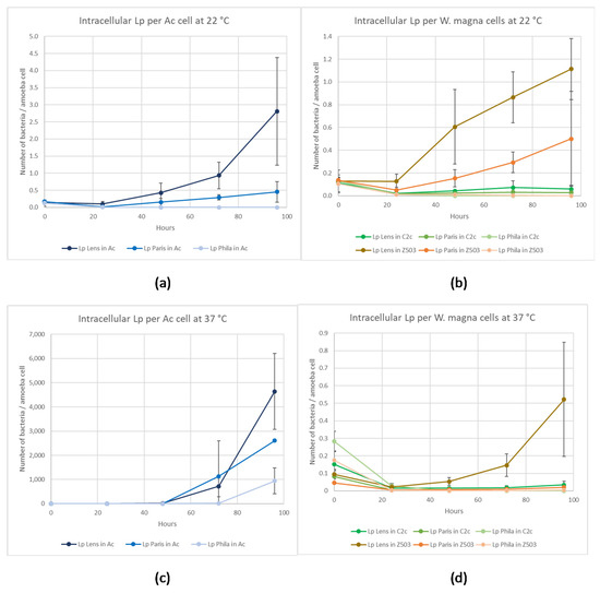 Comparison of the evolution of the number of intracellular L. pneumophila cells (Lens, Paris, and Philadelphia) per amoeba cell (A. castellanii, W. magna C2c Maky, and W. magna Z503). Results are expressed as the mean +/− 95% CI (Confidence Interval based on the standard error of the mean). (a) L. pneumophila number per A. castellanii cell at 22 °C (n = 9 for Lp Lens and Paris, n = 15 for Lp Philadelphia); (b) L. pneumophila number per A. castellanii cell at 37 °C (n = 9); (c) L. pneumophila number per W. magna cell (C2c and Z503) at 22 °C (n = 9 for Lp Lens and Paris, n = 15 for Lp Philadelphia); (d) L. pneumophila number per W. magna cell (C2c and Z503) at 37 °C (n = 9).