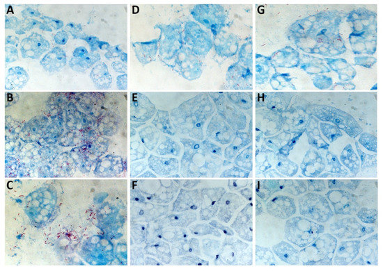 Microscopic observations were performed at T0, T0 + 48 h, and T0 + 96 h. Occurring at T0, excess intracellular L. pneumophila Philadelphia bacteria were observed in the presence of the three amoebas (Figure 5A,D,G). Regarding A. castellanii at 48 h, a strong bacterial multiplication was observed (Figure 5B) which was not observed for both W. magna strains (Figure 5E,H). Occurring at 96 h, lysis of A. castellanii after intracellular bacterial multiplication was clearly evident (Figure 5C), and only a small amount of amoeba lysis could be observed for both W. magna strains (Figure 5F,I).