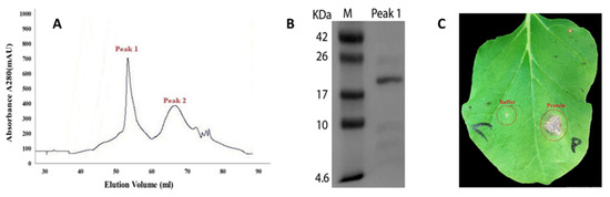 Purification of PeBb1 protein from B. bassiana strain ARSEF 2860 (BB-72). (A) Ion-exchange chromatography produced two peaks (1 and 2) of crude protein obtained from the ammonium sulfate precipitation and purified by ÄKTA Explorer 10 protein purification system; (B) PeBb1 (Peak 1) resolved on a SDS-PAGE gel; (C) necrosis induced by PeBb1 (53 µM) in tobacco leaves recorded at 24 h post infiltration. Control side of leaf lamina was treated with mock buffer (50 mM Tris-HCL, pH 8.0).