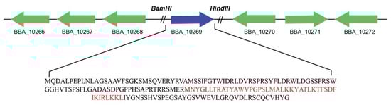 Schematic representation showing the gene BBA_10269 location in the genome of Beauveria bassiana. The red portion in the protein sequence shows active binding domain inside protein.