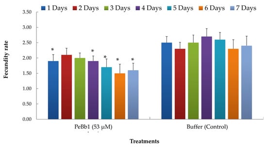 Mean fecundity of M. persicae recorded for the highest concentration of elicitor PeBb1 and for the control treatment. The columns represent mean fecundity rate ± SE (n = 10). Asterisk symbols indicate significant difference among the control and protein treatments (Student’s t-test at p ≤ 0.05).