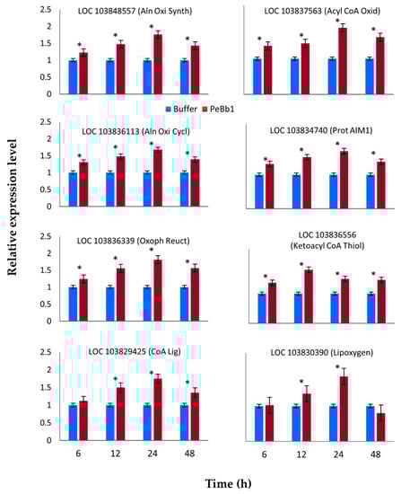 To clarify one of the putative modes of PeBb1 action resulting in plant resistance, we evaluated the expression profiles of ET and JA pathway related marker genes inducing plant defense mechanisms against aphids up to 48 h after treatment with PeBb1 (53 µM) or buffer. RT-qPCR analyses showed that JA pathway-associated genes were moderately elevated, while ET pathway-associated genes exhibited highest levels of expression. Almost all the JA pathway associated key genes (i.e., LOC103848557, LOC103836113, LOC103836339, LOC103829425, LOC103837563, LOC103834740 and LOC103836556) were up-regulated except one gene LOC103830390 that exhibited no considerable difference between the protein- and buffer-treated plants after 6 h of aphid attack and was down-regulated after 24 h of aphid attack (Figure 5). Maximum gene expression level was observed at 12 and 24 h post aphid infestation. On the other hand, all ethylene pathway linked genes (i.e., LOC103836799, LOC103835047, LOC103833884, and LOC103828296) were up-regulated at each time after the application of elicitor and aphid attack (Figure 6).