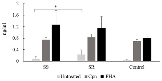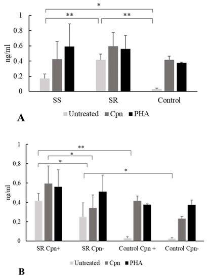 Moreover, significantly higher IL-10 production was detected without stimulation in C. pneumoniae seropositive, steroid-resistant patients than in steroid-sensitive patients (0.41 ± 0.07 ng/mL vs. 0.17 ± 0.06 ng/mL, p = 0.002) (Figure 2A).
