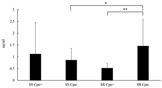 MMP-9 levels were measured in steroid-sensitive (SS) and steroid-resistant (SR) C. pneumoniae seropositive (Cpn+) and seronegative (Cpn−) asthmatic patients using an enzyme-linked immunosorbent assay. Data are expressed as ng/mL (mean ± SD). Significant differences are labelled with asterisks, * p < 0.05 and ** p = 0.01.