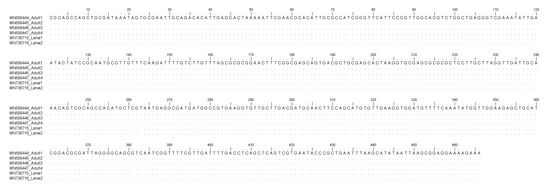 For sequencing the mitochondrial cytochrome C oxidase subunit II (cox2) gene, PCR amplification was performed using the primers 211F (5′-TTTTCTAGTTATATAGATTGRTTTYAT-3′) and 210R (5′-CACCAACTCTTAAAATTATC-3′) [39,40]. PCRs were carried out in a 50 µL volume containing 30 pmol of each primer, MgCl2 2.5 mM (Amersham Pharmacia Biotech. Inc., Piscataway, NJ), 1× PCR buffer (Amersham Pharmacia Biotech. Inc., Piscataway, NJ, USA), DMSO 0.08 mM, dNTPs 0.4 mM (Sigma-Aldrich, St. Louis, MO, USA), 5 U of Taq Polymerase (Amersham Pharmacia Biotech. Inc., Piscataway, NJ, USA), and 10 ng of total DNA. PCR temperature conditions were the following: 94 °C for 3 min (initial denaturation), followed by 34 cycles at 94 °C for 3 min (denaturation), 46 °C for 60 s (annealing), 72 °C for 90 s (extension), followed by post-amplification at 72 °C for 10 min.