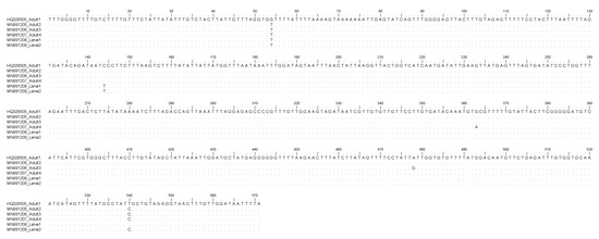 Nucleotide sequence alignment of the mtDNA cox2 obtained from Sulcascaris sulcata larvae (Accession No. MN991208, MN991209) in comparison with those previously identified as S. sulcata adults (Accession No. HQ328505, MN991205; MN991206; MN991207). Dots indicate identity with the consensus sequence.