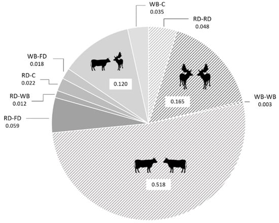 We observed interactions among all the species, the most frequent interactions being the intraspecific of cattle and fallow deer and the third most frequent interaction among cattle and fallow deer. The high frequency of interspecific interactions among these two species could be a consequence of their gregarious tendency in open habitats [,], which can result in mixed groups. This result is very relevant from an epidemiological point of view since the high rate of interaction between groups and with cattle could confer to this species a crucial role in the maintenance of, for instance, TB that is the most relevant disease in ungulates in the study area [], and other shared infections in the domestic compartment in DNP []. However, this quantitative approach may not consider differences in between-species rates of transmission. For instance, wild boar present high excretion rates of TB in DNP [], and therefore risk of transmission per contact maybe be higher.