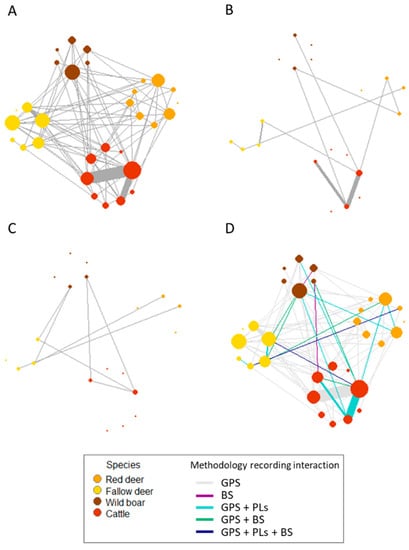Social networks (grouped by species) of the interactions obtained throughout GPS technology (A), proximity logger collars (B), base stations (C) and the combination of the three methodologies (D). The width of the edge is proportional to the number of the interactions between two nodes. The size of the node is proportional to the degree. The colours of the nodes represent the different species. In the global network (D), the colour of the edge represents the methodology that record that interactions (GPS: Global Positioning System, PLs: proximity logger collars, BS: base stations).