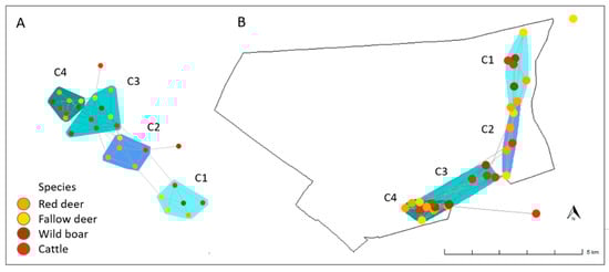 The animal captures were carried out by specialized scientists (B and C experimentation categories) according to the EC Directive 86/609/EEC for animal handling and experiments, following the protocol approved by the Animal Experiment Committee of Castilla-La Mancha University and by the Spanish Ethics Committee (PR-2015-03-08). Three methodologies were used to handle the animals: (i) red deer and fallow deer were stalked and then anesthetized with an anaesthetic rifle; (ii) the wild boar were captured by padded foothold cage traps previously baited with corn; and (iii) finally, cattle were collared during the annual management of routine veterinary inspections. Red deer and fallow deer were anesthetized with a combination of xylazine-ketamine following the protocol described by [] and wild boar with tiletamine-zolazepam and metomidine following the protocol described in [].
