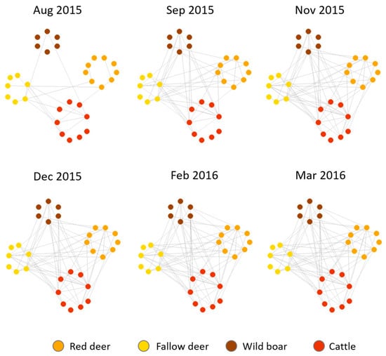 A rapid interconnection among the monitored specific groups was detected during the first weeks of the study (Figure 4 and Supplementary Material: Figure S1). This suggests that in a few weeks an infected animal could introduce a pathogen to all species, particularly in summer and autumn. Previous studies also described the relevance of these seasons in explaining interspecific potential overlap, abundance and aggregation patterns in DNP [,,,].