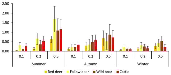 The results of the simulation of pathogen spread showed differences in the number of infected cattle among seasons (F2,271 = 5.61, p < 0.01), after controlling for the probability of infection (F2,271 = 13.64, p ≤ 0.001) (see Figure 5 and Supplementary Material: Figure S3). Higher rates were observed in summer than in winter. When infection started in fallow deer, wild boar or cattle, a greater number of infected cows occurred in summer. However, an infected red deer could infect more cattle if this species was infected in autumn. A single infected fallow deer, wild boar or cow, could infect on average one cow in summer at the higher probability of infection modelled in our simulation (Figure 5). Finally, the wild boar and fallow deer were the species with the greatest probability of infecting cattle (Supplementary Material: Figure S3). The fallow deer infected a greater number of cattle during summer; however, wild boar took this role during the other two seasons, being the species that could infect more cattle during autumn and winter.