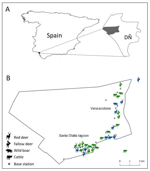 The study was performed in Doñana National Park (hereafter, DNP; 37° 08’ N; 6° 47’ W), which is located between Huelva and Sevilla provinces, south-west of the Iberian Peninsula (Spain) (see Figure 6). DNP has a total extension of 54,252 ha, with a wide variety of biotopes (marsh, beach, scrub and dunes), which maintains a great biodiversity of animals and plants. Within the group of ungulates, DNP maintains a moderate density of red deer (6.3 individuals/100 ha, coefficient of variation [CV] 23.54%), fallow deer (3.9 individuals/100 ha, 25.25% CV) and wild boar (5.7 individuals/100 ha, 20.63% CV) []. Also in DNP, husbandry of an endemic breed of cattle known as “vaca marismeña” is practiced. This domestic ungulate is kept in extensive conditions all year round, except for sanitary inspections that are carried out twice a year. The density of cattle in the study area is 2.26 individuals/100 ha [].