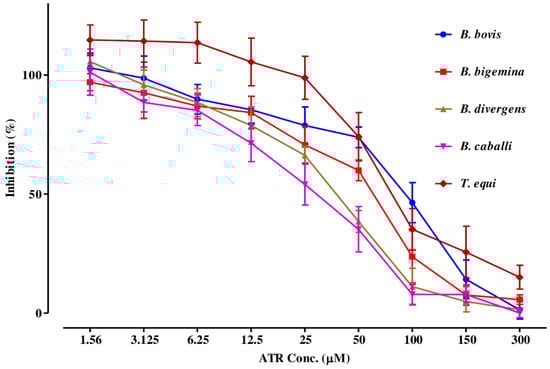Figure 2. The relationship between the inhibition percentage and the concentrations of ATR (µM) on T. equi, B. divergens, B. bigemina, B. caballi, and B. bovis. The non-linear regression (curve fit analysis) in the GraphPad Prism software used for IC50 calculations. The percentage of parasite growth inhibitory efficacy is calculated as the percentage of parasites inhibited divided by that of the positive control wells and the result was subtracted from the negative control wells.