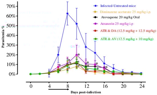Figure 3. In vivo chemotherapeutical prospect of ATR on B. microti and the chemotherapeutic potential of DA-IP, AV-oral, ATR-IP, ATR-DA, and ATR-AV treatment when compared with the positive group. The arrow shows 5 successive days of drug administration starting from day 4 to 8 p.i. The asterisks (*) show the significant variation (p < 0.05) between drug-treated and positive groups. Parasitemia was detected using Giemsa-stained thin blood smears by counting infected RBCs (iRBCs) among 2000 RBCs.