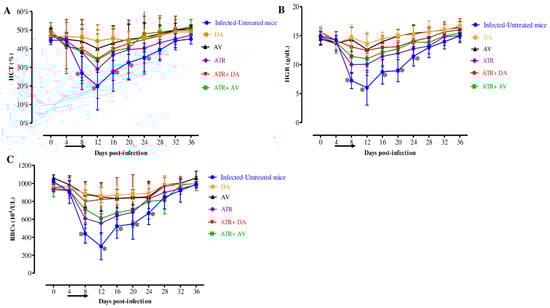 Figure 4. Hematology parameter changes in treated mice in vivo. Graphs showing the (A) hematocrit (HCT), (B) hemoglobin (HGB), and (C) red blood cells (RBCs) changes in treated mice compared to the infected-untreated mice. Asterisks (*) show significant variation (p < 0.05) between drug-treated and positive groups. The arrow shows five successive days of drug administration starting from day 4 to 8 p.i.