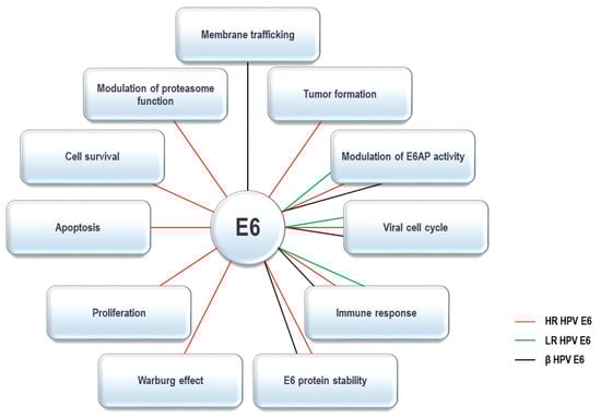 The HPV E6 oncoprotein contains around 150 amino acids and has two zinc fingers created by four CXXC motifs [65,66,67]. The integrity of these motifs is crucial for optimal oncoprotein function and they are highly conserved between all HPV E6 oncoproteins identified so far [68,69]. Recent studies have characterized the crystal structure of the intact E6 oncoprotein and also support the fact that E6 forms interactions with a large number of cellular substrates [67,70,71,72,73]. Recent studies have characterized the crystal structure of the intact HPV-16 E6 oncoprotein and specific domains of HPV-18 E6, HPV-51 E6 and Bovine Papillomavirus 1 (BPV-1) E6, and these data all show that E6 forms interactions with a large number of cellular substrates [70,72,74]. HPV E6 complexes with these substrates through a number of conserved binding motifs. One of these is the so-called PDZ-binding motif (PBM), exclusively present on the C-terminus of HR HPV E6 oncoproteins, through which they bind to numerous PDZ-domain containing proteins [10,61]. Another conserved binding motif on E6 is the LXXLL binding motif. The most notable E6 targets with an LXXLL motif include E6AP, the preferred interacting partner of α-HPV E6 oncoproteins, and MAML-1, interacting with β-HPV E6 oncoproteins [75,76,77,78,79,80]. As mentioned above, E6 oncoproteins from both α- and β-HPV types interact with multiple components of the UPS; these interacting partners and their corresponding cellular functions are summarized in Table 1. By interacting with UPS components, HPV E6 oncoproteins can modulate various cellular functions, which are shown in Figure 1 and will be discussed in more detail below.