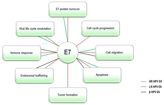 The main function of the HPV E7 oncoprotein is to maintain the infected differentiating cell in a DNA replication-competent state, which it does in part, by targeting the retinoblastoma tumor suppressor (pRb), a critical regulator of cell cycle progression, which controls the G1 to S-phase transition [124]. E7 also binds to the pRb-related members of the pocket protein family, p107 and p130, which assists in driving the cell cycle of the differentiating HPV-infected epithelial cell into an S-phase-like state, an environment suitable for replication of the viral genome [125]. In order to complete these activities, E7 forms interactions with ubiquitin ligases, which are essential elements of the UPS. In addition, E7 was shown to complex with other components of the UPS, and these interactions appeared to be important either for the stability of the oncoprotein or for its role in regulation and modulation of many cellular processes, some of which are summarized in Table 2 and Figure 2.
