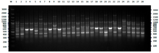 Multilocus sequence typing-polymerase chain reaction (MLST-PCR) fingerprinting of E. coli strains with primers Ec1, Ec2 (Table 4)—example of results for 27 isolates. The numbers indicate the numbers of particular isolates. M: 100 bp DNA ladder.