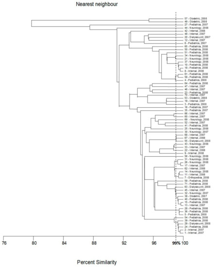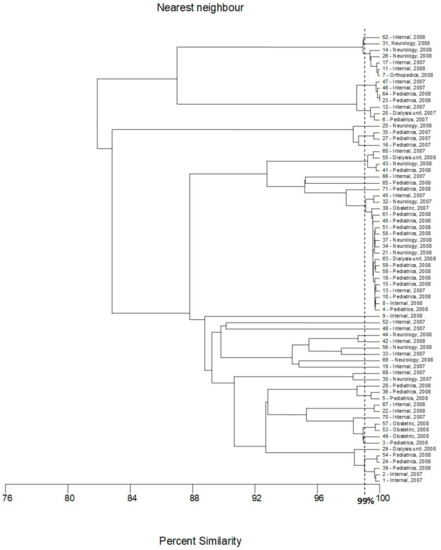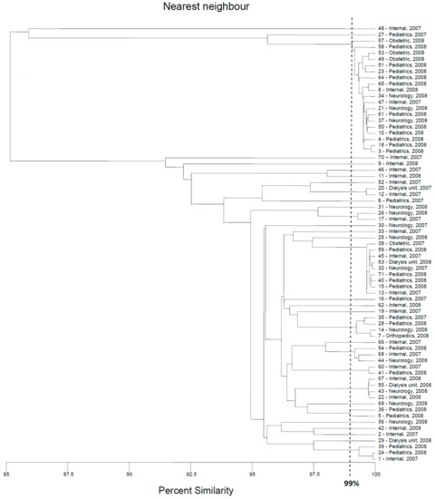 The second-largest genotype contained nine strains, five isolated in 2008 (four from the pediatric unit and one from dialysis unit); the following four strains were isolated in 2007 (two from patients of the internal ward and the two following strains were from internal and neurology units, respectively). Two genotypes consisted of four isolates. Interestingly, only in the case of one of them, two strains were isolated from the same ward (internal) in the same year (2008); other isolates were collected in different places (units of the hospital) or time. Similarly, no evident correlation between place/time of isolation and classification of the strains to the genotypes was observed either for two genotypes that consisted of three isolates (only two strains of one cluster were collected in a pediatric unit in 2008) nor for three genotypes that consisted of two strains. The last two isolates classified to the fourth cluster consisted of two strains that were recovered from the pediatric unit in 2008.