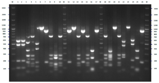 MLST-PCR fingerprinting of E. coli strains with primers Ec9, Ec10 (Table 4)—example of results for 26 isolates. The numbers indicate the numbers of particular isolates. M: 100 bp DNA ladder.