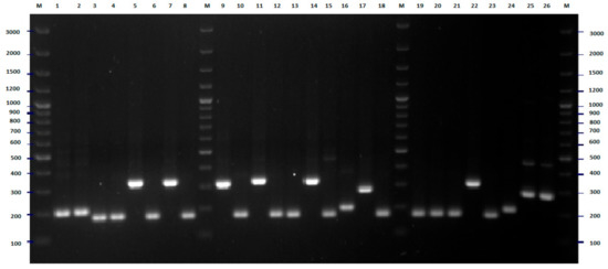 MLST-PCR fingerprinting of E. coli strains with primers Ec5, Ec6 (Table 4)—example of results for 26 isolates. The numbers indicate the numbers of particular isolates. M: 100 bp DNA ladder.