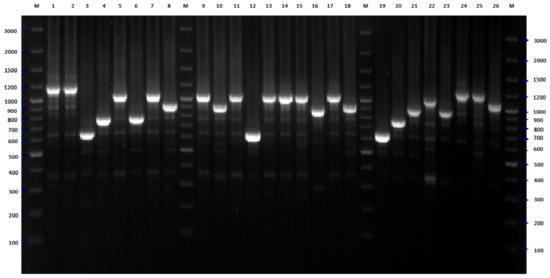 MLST-PCR fingerprinting of E. coli strains with primers Ec11, Ec12 (Table 4)—example of results for 26 isolates. The numbers indicate the numbers of particular isolates. M: 100 bp DNA ladder.