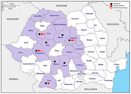 T. brevior DNA was identified in 25 (6.7%; 95% CI: 4.5–9.9) out of 371 samples by mPCR, from which six were confirmed by sequencing. All positive cats had outdoor access and most of them originated from urban areas and were not treated with antihelmintic products (Table 1). Most of the positive samples confirmed by sequencing (4/6) were registered in kittens (4.2%; 95% CI: 1.6–10.2). T. brevior was identified by mPCR in four countries (Harghita, Cluj, Hunedoara, and Dolj) and by sequencing it was confirmed in three out of 16 studied countries (Harghita, Cluj, and Hunedoara) (Figure 1). The co-infections with A. abstrusus were registered in 20 out of 25 positive samples (by mPCR) and in two out of six in the case of positive samples confirmed by sequencing (data not showed).