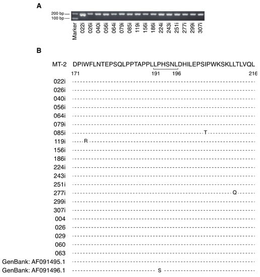 Conservation of a neutralizing domain of gp46 in clinical HTLV-1 isolates. (A) The 187-base-pair region of gp46 from clinical HTLV-1 isolates was amplified and subjected to gel electrophoresis. (B) Reference amino acid sequences of the MT-2 strain. The LAT-27 epitope is shown from residue 191 to 196 in the sequence. Changes in amino acids are indicated along the standard line aligned with the MT-2 sequences.