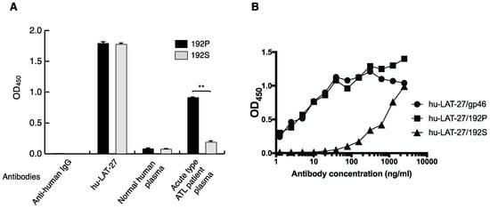 Binding of hu-LAT-27 to the synthetic peptide with substitution. (A,B) HTLV-1 gp46 synthetic peptides, with and without an amino acid substitution at position 192 (proline to serine), 192P, and 192S, respectively (see Materials and Methods), as well as a native gp46 antigen were coated onto 96-well ELISA plates and reacted with hu-LAT-27 (10 μg/mL), normal human plasma (1:400), or acute type ATL patient plasma (1:400). The binding of human IgG was probed using goat anti-human IgG-HRP. Values are shown as the means of the triplicate experiments ± SE. * p < 0.01 (A).