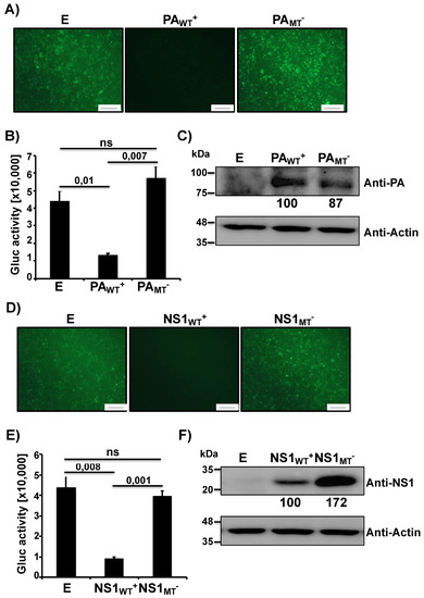 Ability of master donor virus (MDV) A/AA/6/60 live attenuated influenza vaccine (LAIV) PA and NS1 proteins to block host gene expression: Human 293T cells (5 × 105, 12-well plates, triplicates) were transiently co-transfected, using LPF2000, with expression plasmids encoding GFP and Gluc under the control of a chicken beta actin promoter (pCAGGS GFP and pCAGGS Gluc, respectively) together with pDZ plasmids encoding wild-type (WT+) or mutant (MT−) PA or NS1 proteins; or empty (E) plasmid as control. At 24 h post-transfection (p.t.), cells were analyzed by GFP expression (A,D) under a fluorescent microscope and by Gluc activity (B,E) from tissue culture supernatants (TCS) using a luminometer. Representative images are shown. Scale bar = 100 μm. Results represent the means and SDs of triplicate values. Protein expression from cell lysates was evaluated by Western blot (C,F) using specific antibodies for PA (C) or NS1 (F), or actin as the loading control. Molecular markers are indicated on the left. Western blots were quantified by densitometry using the software ImageJ. Relative band intensities (as described in Materials and Methods) are indicated. ns, not statistical.