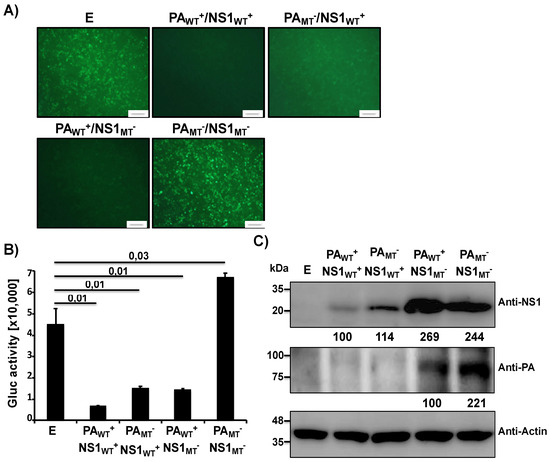 Transfected cells were lysed in RIPA buffer (25 mM Tris HCl pH 7.6, 150 mM NaCl, 1% NP-40, 1% sodium deoxycholate, 0.1% SDS) and proteins were separated by denaturing electrophoresis using 10% SDS-polyacrylamide gels and transferred to a nitrocellulose membrane. Membranes were blocked for 1 h with 5% dried skim milk in phosphate-buffered saline (PBS) containing 0.1% Tween 20 (T-PBS) and incubated overnight at 4 °C with primary rabbit polyclonal antibodies (pAb) against NS1 [53] or a mix of mouse monoclonal antibodies (mAb) against PA (1F6, NR-19225; 5C5, NR-19226; and 8E10, NR-19224) obtained from BEI Resources. A mouse mAb against actin (A1978; Sigma) was used as an internal loading control. Horseradish peroxidase (HRP) secondary antibodies (GE Healthcare) against either mouse or rabbit immunoglobulins (Ig) were used to detect bound primary antibodies. Protein expression was detected with a SuperSignal West Femto maximum-sensitivity chemiluminescent substrate kit (Thermo Scientific) in accordance with the manufacturer’s instructions. Protein bands were normalized to the level of beta-actin expression, and then the level of expression of the WT protein was considered 100%. In the case of Figure 2C, for the anti-PA analysis, PAWT+/NS1MT− was considered 100%.