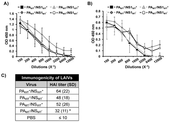Following the safety studies, we next determined if the mutant MDV A/AA/6/60 LAIVs (PAWT+/NS1MT−, PAMT−/NS1WT+, and PAMT−/NS1MT−) induced similar humoral immune responses than that of the WT MDV A/AA/6/60 LAIV (PAWT+/NS1WT+) (Figure 6). To this end, we collected blood from mice infected as shown in Figure 5, 21 days after infection and measured, using ELISA, the antibody responses against the viral H1 protein from pH1N1 (Figure 6A), as well as to all viral proteins using cell lysates from pH1N1-infected MDCK cells (Figure 6B). All the mutant MDV A/AA/6/60 LAIVs (PAWT+/NS1MT−, PAMT−/NS1WT+, and PAMT−/NS1MT−) induced an overall antibody response against the viral HA and other viral proteins that was comparable to that induced by the WT MDV A/AA/6/60 LAIV (PAWT+/NS1WT+) (Figure 6A,B, respectively). Next, we determined the ability of these antibodies to inhibit HA activity, using an hemagglutination inhibition (HAI) assay (Figure 6C). While all four MDV A/AA/6/60 LAIVs induced HAI antibodies, the MDV A/AA/6/60 LAIV containing both mutant PA and NS1 proteins (PAMT−/NS1MT−) induced significantly less HAI antibodies than the WT MDV A/AA/6/60 LAIV (PAWT+/NS1WT+).