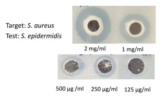 On the agar well inhibition assay, the concentration of cytoplasmic bacteriocin compounds from S. epidermidis ATCC12228 showing from 2 mg, 1 mg, 500 μg, 250 μg, and 125 μg/ ml in each well. Antimicrobial activity decreased with decrease in its concentration. There is no antimicrobial activity of cytoplasmic bacteriocin compounds from S. epidermidis ATCC12228 at concentration of 125 μg/ ml against S. aureus ATCC25923.