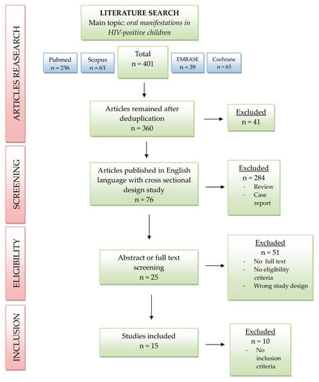 The following search items, combined with the Boolean term “AND,” were used to perform an electronic search in the PubMed, Cochrane Central Library, EMBASE and Scopus databases: oral lesions, oral manifestations, HIV infection (Mesh database terms) and HIV-positive children, and HIV-positive pediatric patients. The search began in November 2018 and ended on 31 March 2019.