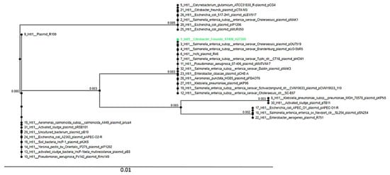 The PHAge Search Tool (PHAST) detected four intact phages (Escher_HK639, Entero_c_1, Salmon_RE_2010, and Salmon_SJ46). The insertion sequences in the genomes belonging to the IS3 family (IS2) and IS5 family (IS903) were predicted by BLAST searches against contigs on the ISFinder database. In silico analysis identified the class 1 integron-integrase gene (IntI1) in H2730R. The relationship between the IntI1 integrase in H2730R and other closely related IntI1 integrases in diverse species obtained from the RAST Server was shown as a phylogenetic tree using the MAFFT online tool (Figure 1). The Intl1 of the H2730R strain had the closest similarity with the Salmonella enterica subsp. enterica serovar Choleraesuis plasmid pOu7519, as depicted in Figure 1.