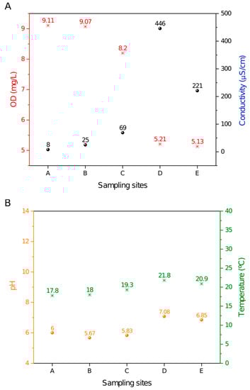 Limnological profile throughout the sampling sites in the Monjolinho River. (A) DO (dissolved oxygen) and conductivity values plotted along the river samples. (B) Temperature and pH values plotted along the river samples.