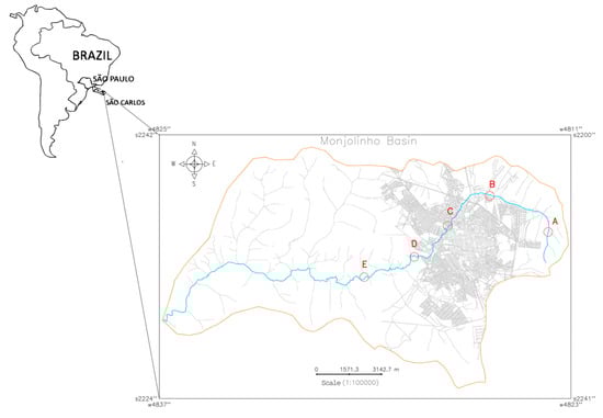 Cadastral map of the Monjolinho River Basin, São Carlos, São Paulo (Brazil) that shows the Monjolinho river (blue line) and sampling sites A–E (in red letters and circles) that were investigated in this study.