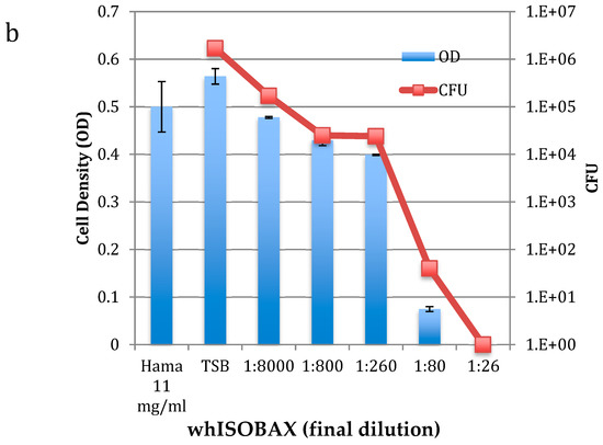 To test for antibacterial activity against S. epidermidis, early exponential S. epidermidis cells were grown overnight with increasing amounts of DIP or WH, and MIC and MBC determined using spectrophotometric and plating methods. As shown in Figure 1a, the MIC of DIP was at 1:200 dilution (>2.5 × 10−3 % free iodine) and the MBC was at 1:100 dilution (>5 × 10−3 % free iodine). As shown in Figure 1b, the MIC of WH was at 1:80 dilution (containing 0.158 mg/mL GAE and 0.216 mg/mL HAMA) and MBC as 1:26 dilution (containing 0.48 mg/mL GAE and 0.665 mg/mL HAMA). As expected from its known molecular mechanisms [14], HAMA itself does not have bactericidal activities even when tested at high concentrations of 11 mg/mL (Figure 1b). The antibacterial activity observed in WH is thus due to other molecules present, such as the phenolic compounds reported in witch hazel (gallic acid and catechins), which are known to have antibacterial activities [21,22,32].