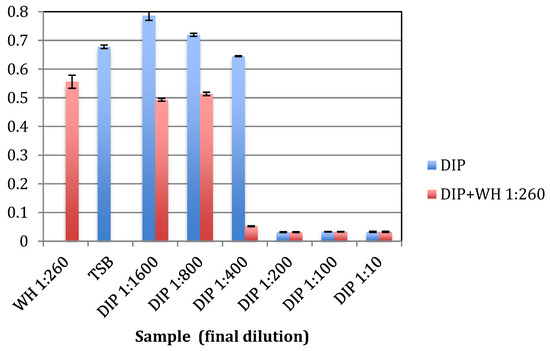The antibacterial effect of DIP and WH were tested on the growth S. aureus USDA strain, where early exponential bacteria were grown overnight with increasing concentrations of DIP or WH. As shown in Figure 6, the MBC of DIP is at 1:80 dilution and the MBC of WH is at 1:20 dilution.