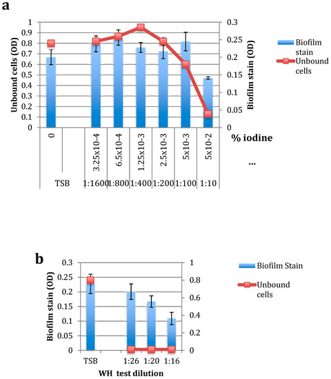 To test the effect of DIP and WH on pre-formed biofilms, S. epidermidis cells in the early log phase of growth were placed in microtiter polystyrene 96-well plates and grown in static conditions for several hours to create a detectable biofilm (containing 5.76 × 106 CFU). Unbound cells were removed, increasing concentrations of DIP (1:10 to 1:1600) or WH (1:16 to 1:26) were added to adherent bacteria, and cells were grown for an additional 18 h. Unbound cells (“UNBOUND”) were removed, and samples plated to determine the MIC and MBC levels. Biofilm bacteria were stained and OD determined. As shown in Figure 4a, at the highest DIP concentration tested (1:10 dilution, or >5 × 10−2 % iodine), no unbound cells were found, but the biofilm load was only slightly reduced. At the MBC level of DIP against planktonic cells (1:100 dilution), DIP had no inhibition of biofilm cells and unbound cell load was only slightly (25%) reduced. These results indicate that while DIP is effective in killing planktonic bacteria, it is not as effective in eradicating bacterial biofilms. Biofilms are commonly found on udders of milking cows [8] and can become a source for new infections.