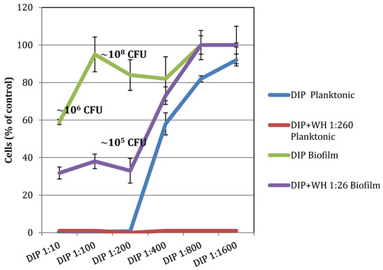 The effect of DIP +/− WH on the growth of planktonic vs. biofilm S. epidermidis. S. epidermidis (planktonic or biofilm cells) cells were grown with increasing amounts of DIP in the absence or presence of WH 1:260 or WH 1:26. Cell density was determined at OD 630 nm and the amount of biofilm was determined by staining. CFU was determined by plating. Percentages of control values are presented; control (TSB) or WH at the tested dilutions representing 100%. Experiments were done in triplicates and standard deviations presented.