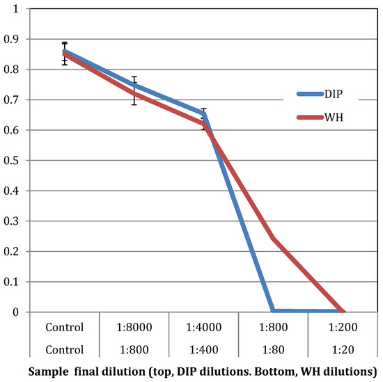 S. aureus produce multiple toxins, which are commonly regulated once their cell number increase and they reach a certain quorum [9,30]. One of these toxins is staphylococcus enterotoxin A (SEA), which is notoriously involved in food poisoning [29]. To test for the effect of DIP or WH on toxin production, we tested for SEA in supernatants of cells grown with DIP or WH. As shown in Figure 7, when DIP or WH was added at dilutions that do not affect cell growth (DIP 1:8000 and WH 1:800), only WH inhibited toxin production. The inhibitory effect of WH is probably due to its high content of HAMA, a known quorum-sensing inhibitor [14].