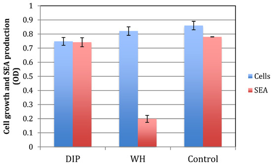 The effect of DIP and WH on S. aureus growth and SEA production. S. aureus cells were grown overnight with DIP (1:8000), WH (1:800), or TSB as a control. Cell density was determined spectrophotometrically at OD 630 nm (cells). Cells were collected and removed by centrifugation. Supernatants were collected, and the presence of SEA was determined by “sandwich” ELISA (SEA). Experiments were done in triplicates and standard deviations presented.