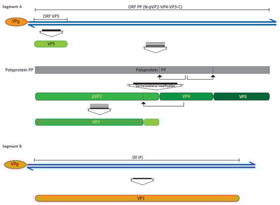 The genome is constituted by two segments of dsRNA named A and B. Although the virion was traditionally thought to contain a single set of both segments, it is now known to be polyploid, able to package 1, 1.5, and even 2 genome equivalents []. Segment A, with a size between 2962 and 3097 bp [], contains two open reading frames (ORF; Figure 1). The ORF PP, the largest one, encodes a polyprotein of around 106 kDa, which comprises most of the viral proteins: NH2-pVP2-VP4-VP3-COOH. Due to the internal proteolytic activity of the VP4 region, this polyprotein suffers a co-translational modification consisting in a protease cleavage, between an alanine and a serine, in two positions: between amino acids 734 and 735, to release the minor capsid protein VP3, and between amino acids 508 and 509, to produce the non-structural viral protein VP4 and pVP2; this is an immature precursor of the major structural protein VP2 which, during morphogenesis, suffers proteolytic cleavage creating the mature structural form and three additional small peptides which remain associated to the virion []. The second ORF of this segment, ORF VP5, codifying the non-structural VP5 protein, is in fact the first one since it overlaps ORF PP and its start codon precedes the ORF PP start codon by a few nucleotides. Finally, segment B, of around 2400 bp, contains a single ORF encoding the minor structural protein VP1.