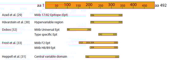 Before that study, VP2 was already known to carry the cell attachment sites and to be responsible for most of the antigenicity of the virus. As early as in the late 1980s, Caswel-Reno et al. [] demonstrated the presence of neutralization epitopes in VP2, and Azad et al. [] located the same type of epitopes in an internal region of VP2—between amino acids 206 and 350—which was recognized by the virus-neutralizing monoclonal antibody (MAb) 17/82 (Figure 3). That section of VP2 was soon recognized by Håvarstein et al. [] to be a hypervariable region in the VP2 sequence, almost coinciding with the widely known “central variable domain” described by Heppell et al. []. Other studies using MAbs confirmed VP2 to be the main protein responsible for IPNV antigenicity, and in one such study Dobos [] found a serotype-specific epitope, also located in that central region of the molecule.