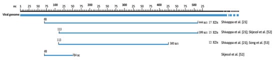 The viral genome encodes five viral proteins named from VP1 to VP5. Three of them (VP1, VP2, and VP3) are structural, and to date two (VP4 and VP5) are believed to be non-structural proteins. An ORF encoding a putative sixth 25 kDa viral protein has been found by Shivappa et al. [] overlapping part of the ORF PP, between the pVP2 and VP4 sequences. They found that sequence exclusively in the Sp strain, and later a similar sequence was also found in a few Chilean strains. Due to the presence of positively-charged domains, it was speculated to interact with the inner plasmatic membrane leaflet [].